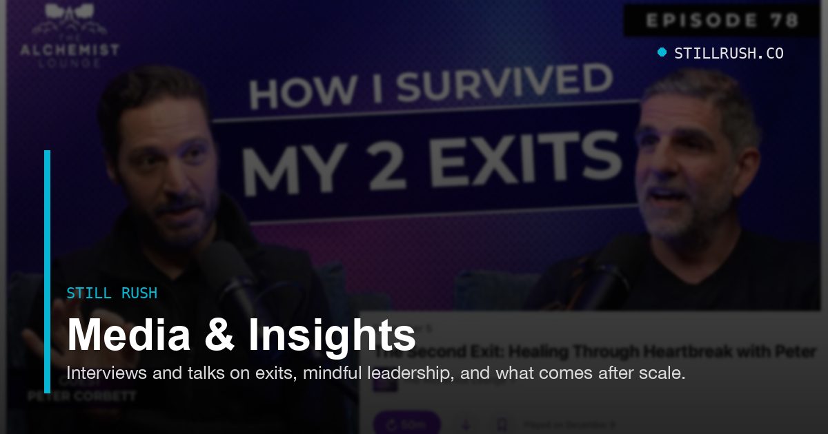Peter Corbett's selected podcast interviews, talks, and press on founder exits, mindful leadership, burnout, mortality, divorce, service, and what comes after scale.